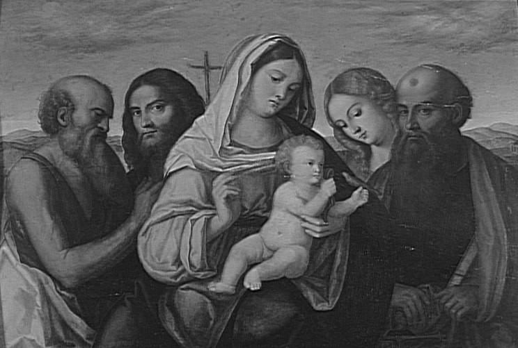 figures bibliques (Sainte Famille, Vierge, à mi-corps, de trois-quarts, Enfant Jésus : nu, assis, saint Joseph, à mi-corps, de profil, saint Jean-Baptiste, tête, de trois-quarts, sainte Madeleine, tête, de trois-quarts, saint Paul de Tarse, à mi-corps, de trois-quarts, livre)