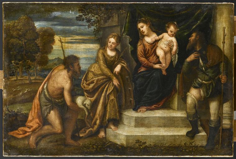figures bibliques (Vierge à l'Enfant, assis, trône, Enfant Jésus : nu, saint Roch de Montpellier, sainte Catherine d'Alexandrie, en pied, attribut : roue, saint Jean-Baptiste, agenouillé, attribut : agneau) ; fond de paysage
