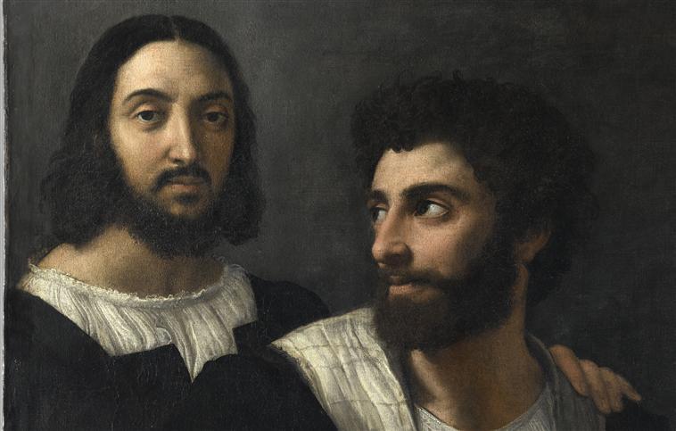 portrait collectif (Santi Raffaello, homme, en buste, de face, homme, assis, de trois-quarts, épée, barbe, peintre, Italien) ; autoportrait (Santi Raffaello, homme, à mi-corps, de face, peintre)