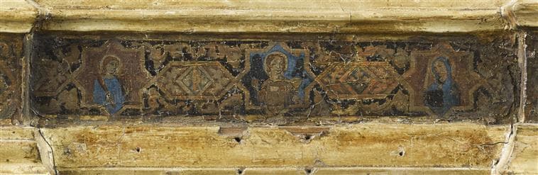 LA VIERGE ET L'ENFANT ENTOURES D'ANGES ET DE SAINTS (CENTRE) ; LE CHRIST, BENISSANT (AU DESSUS, MEDAILLON) ; LA NATIVITE ET L'ANNONCE AUX BERGERS (A GAUCHE) ; L'ANGE DE L'ANNONCIATION (AU DESSUS, DANS MEDAILLON) ; LA CRUCIFIXION (A DROITE) ; LA VIERGE DE L'ANNONCIATION (AU DESSUS, DANS UN MEDAILLON)