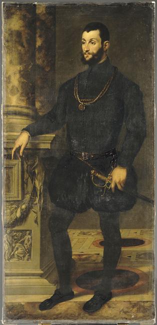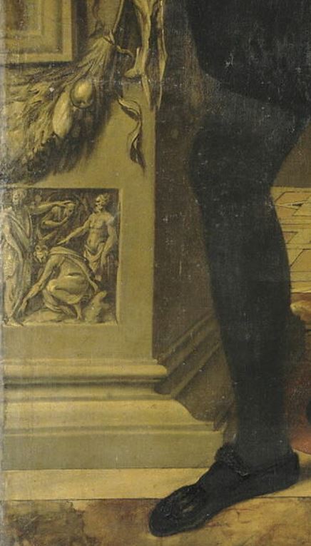 portrait d'inconnu (homme, en pied, de trois-quarts, accoudé, soubassement, colonne, épée, barbe, pavement, décoration, ?, relief : à l'antique)