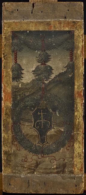 POP | Plateforme ouverte du patrimoineECU INSCRIT DANS UNE COURONNE DE FEUILLAGE SUR UN FOND DE PAYSAGE
