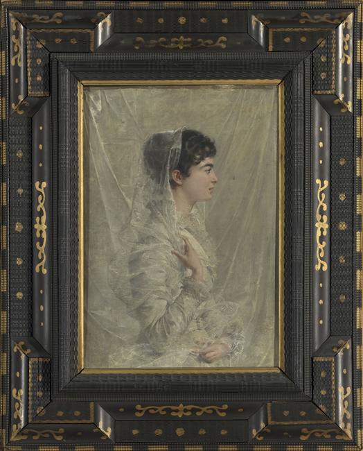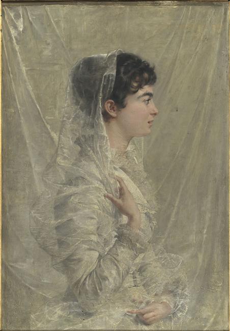 portrait (Dubufe Cécile, femme, à mi-corps, de profil, coiffe, effet de tissu)