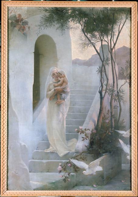 figure biblique (Vierge à l'Enfant, en pied, de face, escalier, colombe, rose, laurier, ?, Italie, ?) ; fond de paysage