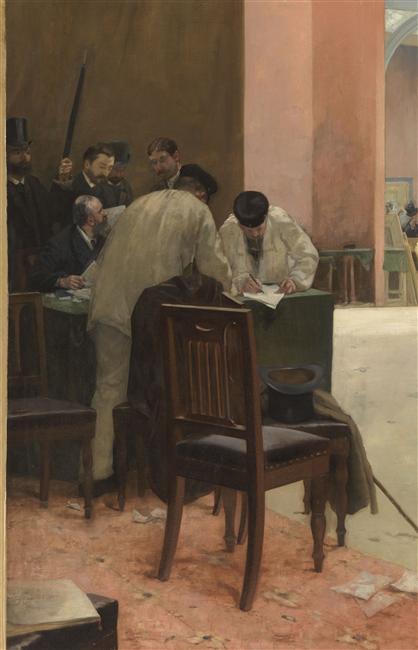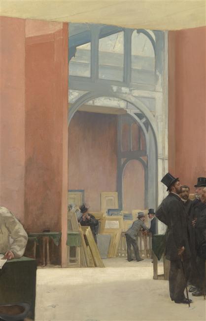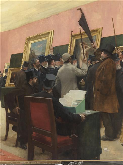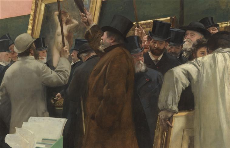 scène historique (réunion, sélection, amateur d'art, peintre, manifestation officielle, exposition artistique : peinture, canne, parapluie) ; portrait collectif (homme, Barrias Félix Joseph, Benjamin-Constant Jean, Bouguereau William, Busson Charles, Cabanel Alexandre, ?, Carolus-Duran, Cazin Jean Charles, Cormon Fernand, Detaille Jean-Baptiste Edouard, Duez Ernest Ange, Français François Louis, Guillaumet Gustave, Henner Jean Jacques, Laurens Jean Paul, Lavielle Eugène, ?, Luminais Evariste Vital, ?, Lefèbre Jules, Leroux Hector, Maignan Albert, Neuville Alphonse de, Pille Charles Henri, Protais Paul Alexandre, Puvis de Chavannes Pierre, Rapin Alexandre, Roll Alfred, Robert-Fleury Tony, Vollon Antoine, Vuillefroy Dominique Félix de, peintre) ; autoportrait (Gervex Henri, homme, peintre)