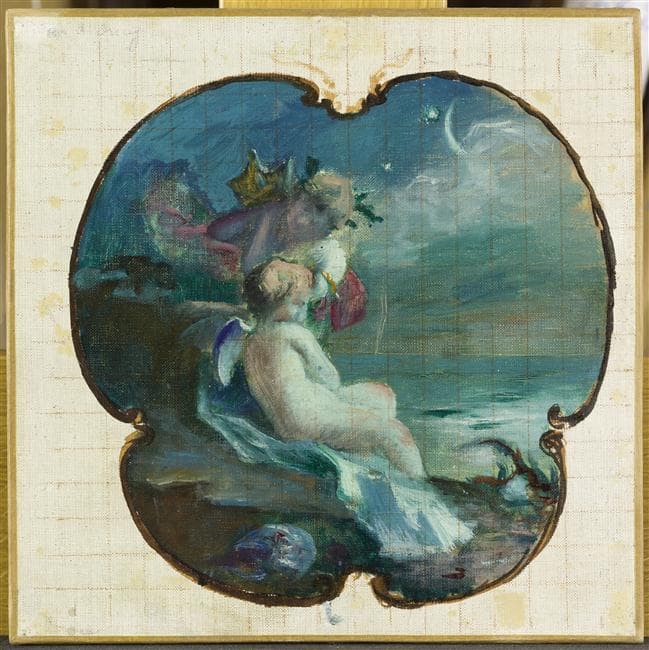 esquisse pour un dessus de porte (porte sud-est) de la salle à manger du grand hôtel de la gare d'Orsay à Paris, édifié de 1898 à 1900 ; cette décoration de G. Ferrier comprenant trois plafonds et des trumeaux au dessus des portes sur le thème des saisons et des heures du jour et de la nuit, est toujours en place ; le musée d'Orsay possède deux esquisses (RF 1984 26)