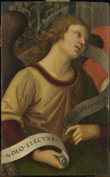 fragment du retable de saint Nicolas de Tolentino très endommagé par un tremblement de terre en 1789 ; commandé le 10 décembre 1500 à Raphaël et à Evangelista da Pian di Meleto par Andrea di Tommaso-Baronci pour la chapelle Baronci de l'église Sant'Agostino à Citta di Castello ; dessin préparatoire pour l'ensemble, avec au verso des études de détails (Lille, musée des beaux-arts) ; dessin pour des détails et au verso étude en rapport avec l'ange (Oxford, Ashmolean museum) ; dessin pour la tête du démon (Paris, musée du Louvre, cabinet des dessins) ; autres fragments du retable de saint Nicolas de Tolentino : le père éternel et la Vierge (deux fragments, Naples, Pinacothèque de Capodimonte) , ange (Brescia, pinacothèque Tosio-Martinengo)