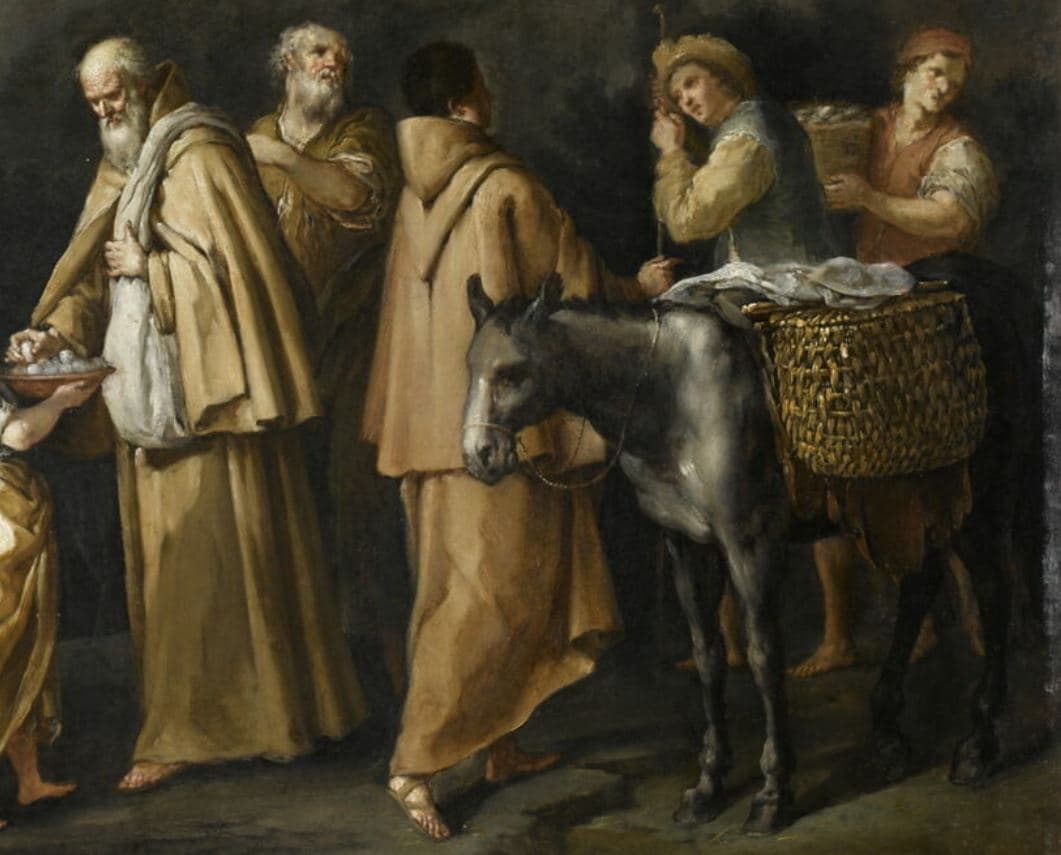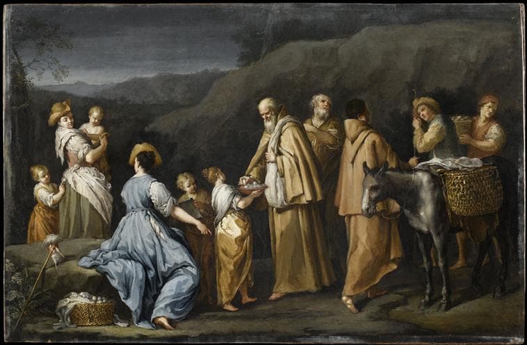 Religieux quêteurs à qui une jeune fille donne des oeufs