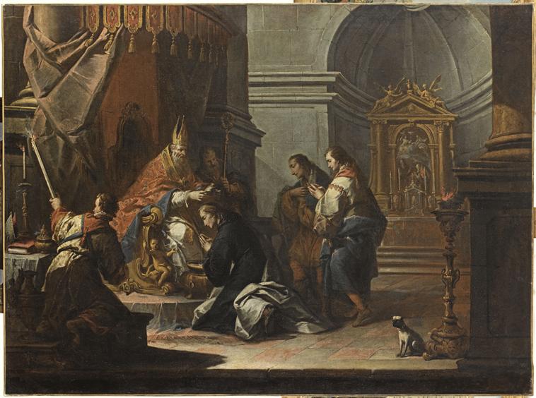 scène historique (baptême, saint Daniel de Padoue, saint Prosdocime de Padoue : évêque, église, intérieur, autel, dais, carlin, ?)