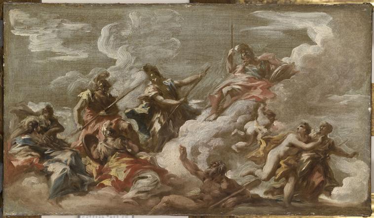 esquisse pour un des quatre plafonds que Pelligrini peignit entre 1736 et 1737 au château de Mannheim pour la chambre de l'empereur ; les trois autres plafonds avaient respectivement comme sujet : allégorie de l'Aurore, les quatre parties du monde, le triomphe des arts et des sciences ; ces quatre plafonds furent détruits durant la dernière guerre