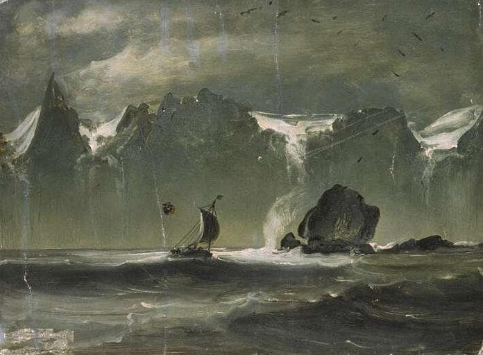 commandé par Louis-Philippe pour commémorer son voyage de 1795 en Laponie;appartient à une série de 31 esquisses, 26 sont conservées au Louvre, 7 sont perdues, (inv 997, 998, 1010, 1011, 1017, 1019, 1027) , 2 tableaux achevés de l'artiste représentant également des sites nordiques, et sans doute en rapport avec cette commande, sont déposés au musée du Tréport depuis 1896 (inv 993 : vue du cap nord, et inv 994 : vue de Drontheim);numéros d'inventaire des autres éléments : inv 995, inv 996, inv 999 à inv 1001, inv 1003 à inv 1009, inv 1012 à inv 1016, inv 1018, inv 1020 à inv 1026