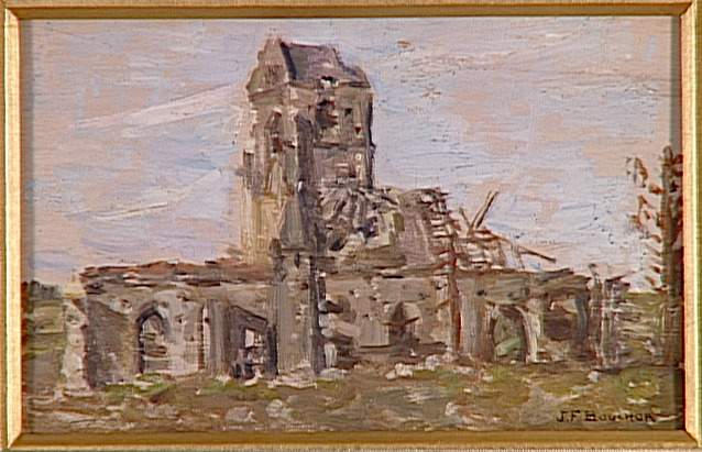 paysage (village, Cutry, Première Guerre mondiale, église, ruines, destruction, clocher, arbre : végétal défeuillé, végétation, ciel)
