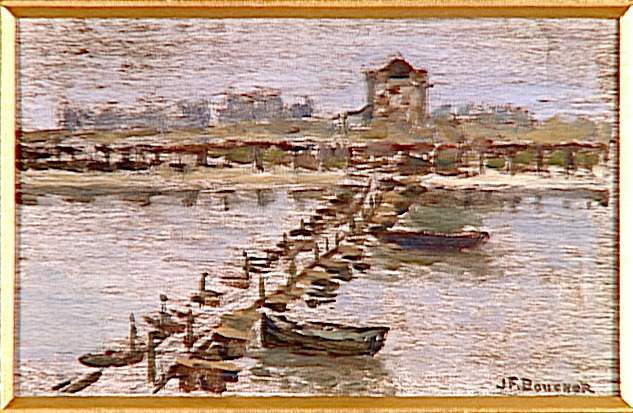 paysage (Nieuport, Première Guerre mondiale, cours d'eau, pont, barque, berge, maison, arbre, ciel)