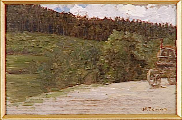 paysage (route, transport par véhicule : intendance, guerre 14-18, souche de cheminée, pré, bosquet, ciel, nuage)