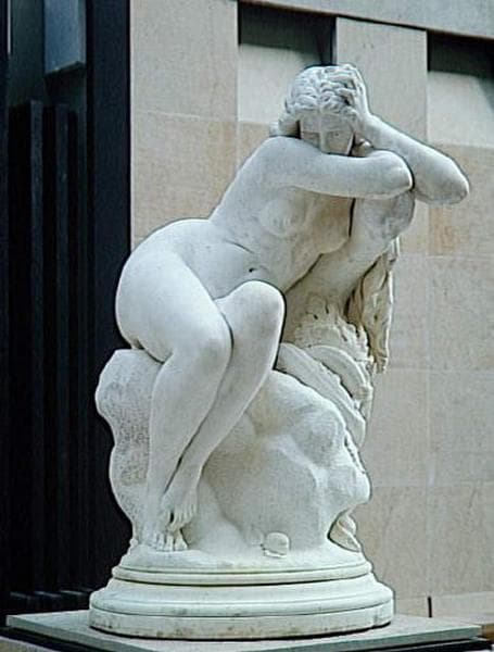 LE MODELE EN PLATRE EXECUTE A ROME EN 1867 COMME TRAVAIL DE TROISIEME ANNEE FUT ENVOYE A PARIS ET ACQUIS PAR L'ETAT EN 1869, SA LOCALISATION EST INCONNUE DE MEME QUE CELLE D'UNE MAQUETTE EN PLATRE DONNEE PAR DELAPLANCHE AU MUSEE DU LUXEMBOURG EN 1887 ; DES ESQUISSES EN CIRE FURENT DONNEES A LA NY CARLSBERG GLYPTOTEK DE COPENHAGUE PAR LA VEUVE DE DELAPLANCHE ; UN DESSIN EST CONSERVE AU CABINET DES DESSINS DU LOUVRE (RF 15 565) ; UN MOULAGE EN PLATRE ACQUIS EN 1892 ET CONSERVE AU MUSEE DU LOUVRE (RF 906) N'EST PAS LOCALISE ; IL POURRAIT ETRE LE MEME TIRAGE QUE CELUI EXECUTE SUR LE MODELE PRETE PAR MME DELAPLANCHE EN 1892? ; UN MOULAGE EST CONSERVE A LA NY CARLSBERG GLYPTOTEK DE COPENHAGUE, UN AUTRE AU MUSEE-CHATEAU D'ANNECY, UN TROISIEME AU MUSEE DE TOULON ; REDUCTIONS EN MARBRE DONT UNE PRESENTEE A L'EXP. UN