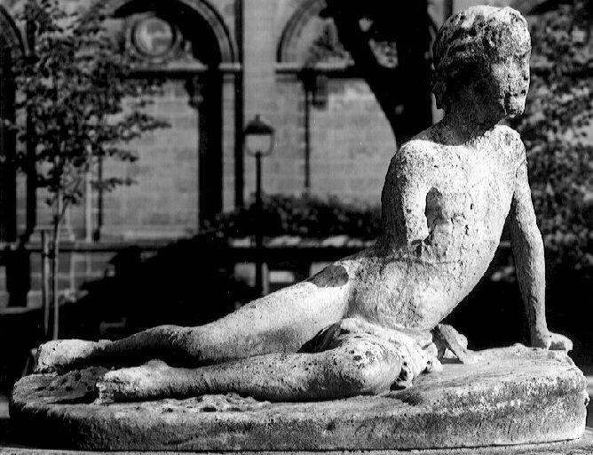 'Giotto est représenté par un enfant dénudé allongé, dont le buste a demi redressé, s'appuie sur le bras gauche tendu. Les traits du visage sont complètement effacés le marbre étant totalement rongé.'/Marie-Noëlle Maynard
