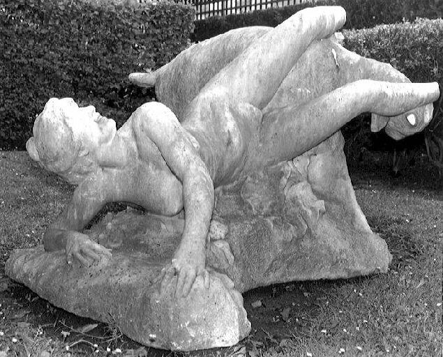 l'oeuvre est très abîmée. Le marbre est fondu et sali. Les traits du visage de la figure ne sont pas visibles. Les pieds de la bacchante ainsi que les cornes et la barbiche de la chèvre sont cassés. Il n'y a plus de traces de signature et de date