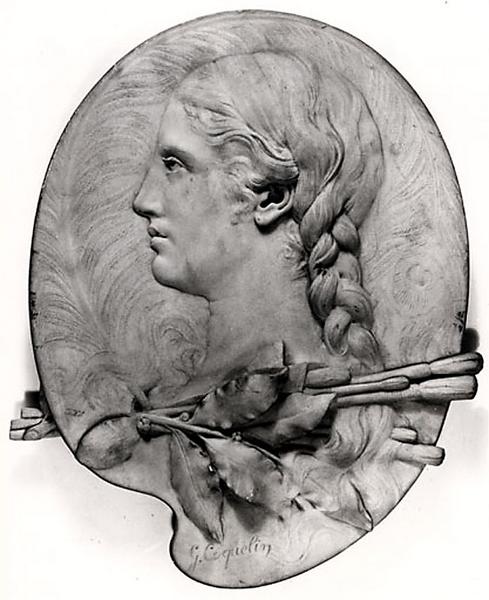 figure (allégorie : art de la peinture, femme, tête, de profil, palette, feuille) ; plume ; paon