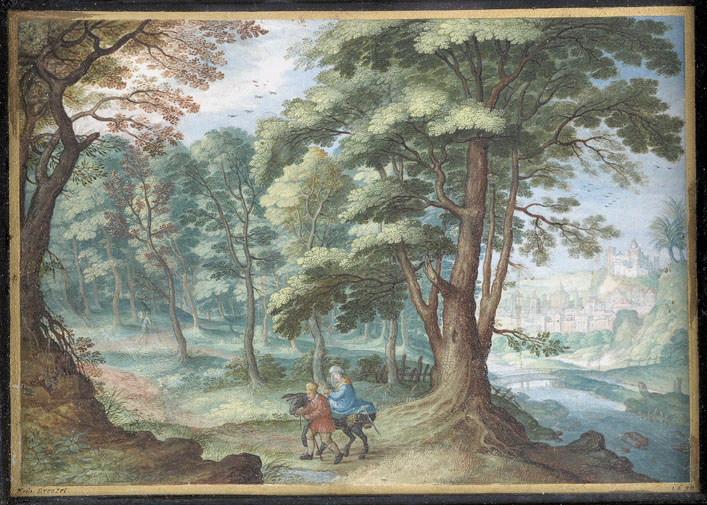 scène biblique ; paysage (Fuite en Egypte, âne, forêt, clairière, fleuve, village, fortification, pont)