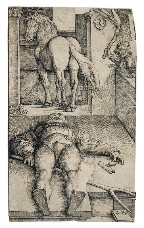 En 1544, peu de temps avant sa mort, Baldung réalise l'une de ses plus saisissantes gravures, Le Palefrenier ensorcelé, dont il existe un dessin préparatoire daté 1544 (Koch 143) et conservé à Bâle (Öffentliche Kunstsammlung), où d'ailleurs seul le personnage du palefrenier est esquissé. Dans l'oeuvre traitée, au même titre que le monogramme HB placé sur une tablette apposée contre la marche en bas à droite, le blason de la famille Baldung, muni de la licorne, figure dans la représentation en haut à droite et procède d'un dessin à la plume également daté 1544 (Koch 142), que détient le British Museum à Londres. De par la position frondeuse de la corne et des deux pattes avant, l'animal héraldique gravé paraît s'acharner sur quelque adversaire, plus qu'il ne le combat avec superbe, comme le suggère le dessin de Londres. Cette différence d'intensité entre le projet dessiné et la gravure peut également s'observer dans la position des mains du palefrenier : dans la xylographie, l'artiste réussit un véritable arrêt sur image, montrant l'instant précis où l'étrille et la fourche, que le valet d'écurie venait d'utiliser ou voulait utiliser, lui échappent des mains. Dans le dessin, en revanche, la main droite paraît un peu grossière, la lecture de la main gauche n'est pas immédiate et le chapeau semble avoir été soigneusement posé par terre, l'ensemble étant incompatible avec l'impression d'instantané et d'événement saisissant que Baldung a si bien rendue dans la gravure. Le palefrenier gît allongé sur une estrade, exactement face au spectateur, qui découvre ainsi le corps étendu selon le raccourci le plus abrupt et le plus saisissant de tout l'oeuvre de Baldung, voire de la gravure en Occident. En 1515-1517, l'artiste avait déjà abordé, dans la Déploration (B. VII, 5 ; Mende 40), la mise en perspective frontale du Christ mort déposé à terre, mais il l'avait limitée au buste, tandis que les jambes repliées et vues en diagonale semblaient se désolidariser du reste du corps. Le Palefrenier, de manière surprenante, en même temps qu'il crée la profondeur spatiale, donne une indication de mesure : relativement à la feuille, le personnage représente exactement la moitié de la hauteur de la gravure, d'une part, et les semelles de ses chaussures, à la verticale, viennent pour ainsi dire ' prendre appui ' sur la surface de la feuille gravée, d'autre part, manière géniale de dénoncer l'illusion d'optique et la construction mentale qu'est la perspective. Le fait d'avoir réalisé une ' découpe ' dans l'estrade a permis à Baldung de poser dans ce retrait et à même le sol une tablette portant son monogramme, mais surtout de situer le spectateur : il est confiné dans un espace plus bas que le podium et extérieur à la scène. La moitié supérieure de l'image est réservée aux deux autres protagonistes : le cheval, devant le râtelier vide, se tourne du côté gauche pour tenter d'en comprendre la raison et découvre gisant à terre celui qui venait de l'étriller et qui était censé lui apporter sa ration de foin. Interpellé par le spectacle, il remue légèrement la queue, sans pour autant percevoir, à sa droite, la vieille femme aux traits de sorcière qui est véritablement à l'origine des événements. Celle-ci, coiffée d'un chapeau cachant ses cheveux dépenaillés et dévoilant un sein, s'est appuyée contre un mur et brandit telle une furie un flambeau, celui qui a jeté un sort au palefrenier en le terrassant. Le caractère insensé de la scène est généré par l'envoûtement de la femme-sorcière, dont à aucun moment le danger n'a été perçu, mais qui a pris palefrenier et cheval dans ses rets. La technique, inhabituelle chez Baldung, du trait quasi tremblotant, surtout réservé au mur derrière la sorcière et au sol de l'écurie, renforce l'aspect insolite de la scène, par ailleurs construite avec une économie de lignes et de volumes qui accroît considérablement l'impact de l'image. L'intérêt de Baldung pour la représentation du démoniaque ou même du diabolique n'est pas nouveau. Tout jeune, il figurait déjà des sorcières avec une intensité étonnante, et même durant la mise en oeuvre du maître-autel de la cathédrale de Fribourg-en-Brisgau. Toutefois, comme l'a suggéré A. von Rüstow, ' le diabolique avait encore sa place à côté du divin, et le démoniaque côtoyait les saints. Dieu, à présent, a disparu de la surface de l'image, et le Diable, en tant qu'Antéchrist, n'est pas resté davantage. La Nature en tant que telle est vécue et représentée comme démoniaque, en l'absence du divin et loin de Dieu '. (Anny Claire Haus) ; voir aussi : Le palefrenier ensorcelé (77.000.0.9) autre épreuve