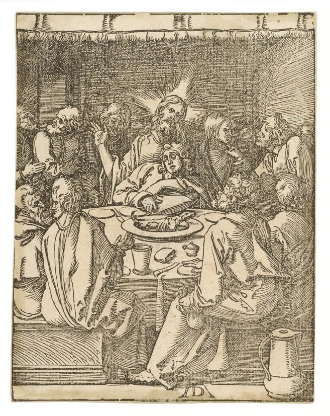 La Dernière Cène occupe une place très importante dans les Evangiles. Elle annonce à la fois la trahison et l'institution de l'Eucharistie. Dürer met l'accent sur la Passion. Le cadrage très serré coupe les figures des marges latérales et occulte même un apôtre vraisemblablement situé hors de la pièce. St Jean endormi se serre contre le Christ confiant, tandis que Judas placé au premier plan tient dans sa main gauche la bourse munie des trente deniers de la trahison. (Anny Claire Haus)