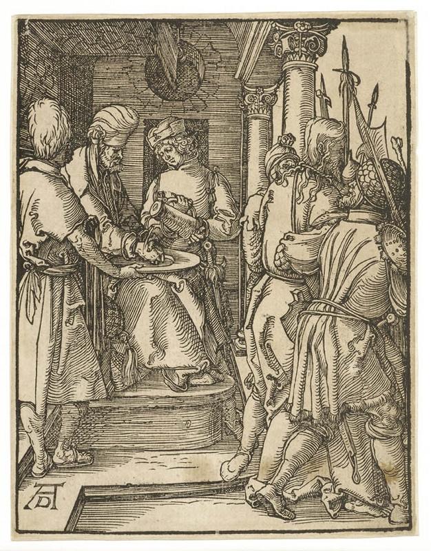 monogramme, devant en bas à gauche : 42. Pilate se lavant les mains B. 36 ; Meder 145 Vers 1509 Bois 12,9 x 9,8 cm au trait carré (F. 13,2 x 10,2 cm) Signé du monogramme, en bas à g. Au verso, marque circulaire : Annotation au crayon : Vergé ; tampon du musée, derrière, marque circulaire : KUPFERSTICH SAMMLUNG STRASSBURG.