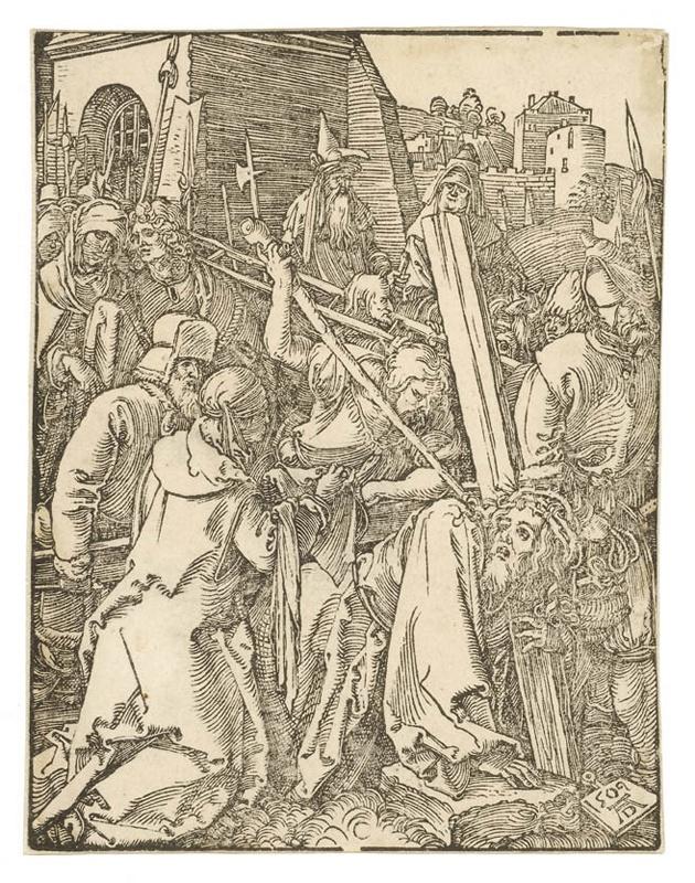 Simon de Cyrène issu de la campagne fut chargé d'aider Jésus à porter la croix. (Luc, XXIII, 26-27) Représentation enrichie par des éléments puisés dans les Evangiles apocryphes et le théâtre religieux, cf. la Vierge, saint Jean et rencontre avec sainte Véronique. Reprise d'un type de composition presque identique à celui de la 'Grande Passion sur bois'. L'interprétation du sujet est cependant tout autre : humaine et émouvante sans grandiloquence. Non plus l'élégance de la pose du Christ, mais l'expression d'un épuisement psychique et physique qui brise le corps et burine le visage. Près de tomber, le Christ s'accroche à la croix et regarde, pathétique, vers la Véronique qui vient pour essuyer la Sainte Face. (Anny Claire Haus)