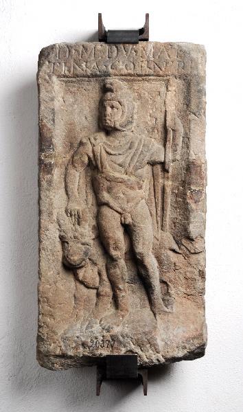 Le dieu est imberbe debout de face dans une niche rectangulaire, les jambes légèrement écartées, la tête tournée de trois-quarts regardant vers la droite. Il est nu, portant simplement un manteau agrafé sur l'épaule droite, dont les plis réguliers couvrent les épaules et se déploient en V sur la poitrine. Un casque muni de larges couvre-joues protège le visage dont les traits sont bien indiqués. De la main gauche levée, il tient une lance dont la hampe semble posée sur le sol derrière le taureau. Le bras droit, écarté du corps, forme un arrondi et la main repose sur la tête du taureau debout derrière lui, qu'il semble retenir par les cornes. L'animal, au corps puissant, est placé de profil, sauf la tête qui est de face. Les membres antérieurs terminés par des sabots fourchus sont bien conservés, mais l'arrière-train est abimé. Si la base du monument est grossièrement épannelée, il n'en est pas de même du fronton lisse, porteur d'une inscription en deux lignes, gravée sur la bordure sommitale : D(eo) Medru Matutina Cobnerti Fil(ia) Notes : Cette inscription nous révèle ainsi le nom de la divinité, Mider ou Medros, que Forrer avait proposé d'identifier de façon erronée à Mithra et qui semble bien être une divinité guerrière, une sorte de Mars « indigène » comme en témoignent le casque et la lance dont il est équipé. Le nom gaulois des dédicants plaide également pour une divinité régionale. A l'appui de cette hypothèse, on peut citer un second bas-relief retrouvé un peu plus au Nord, près de Gunstett, et conservé dans les collections du Musée historique de Haguenau (Espérandieu VII, 1918, n° 5560). La comparaison entre les deux reliefs est troublante : même schéma iconographique, même position du dieu et du taureau, mêmes détails du casque et de la lance.