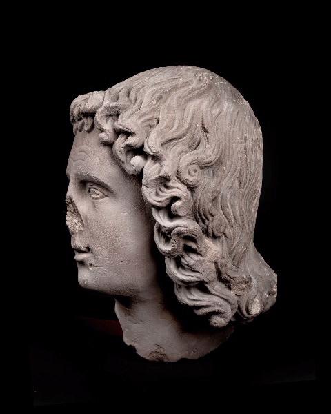 Tête imberbe aux traits juvéniles, tournée vers la droite. L'abondante chevelure bouclée retombe sur le front. Modelé angulaire, lèvres entrouvertes, yeux rapprochés, en amande, front haut. Coupée au ras du cou. Nez cassé. Yeux et lèvre supérieure abîmés.