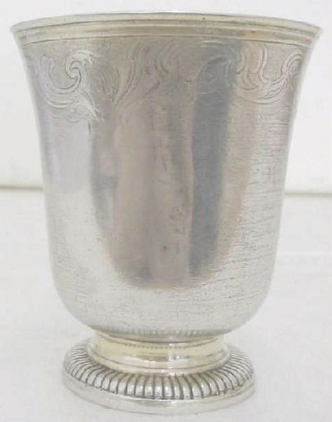 Gobelet de forme tulipe reposant sur un piédouche godronné. Sous le bord supérieur mouluré, frise de rinceaux et de coquilles rocailles gravée en réserve sur un fond amati épousant le mouvement du motif. Dorure très usée. Dessous également doré