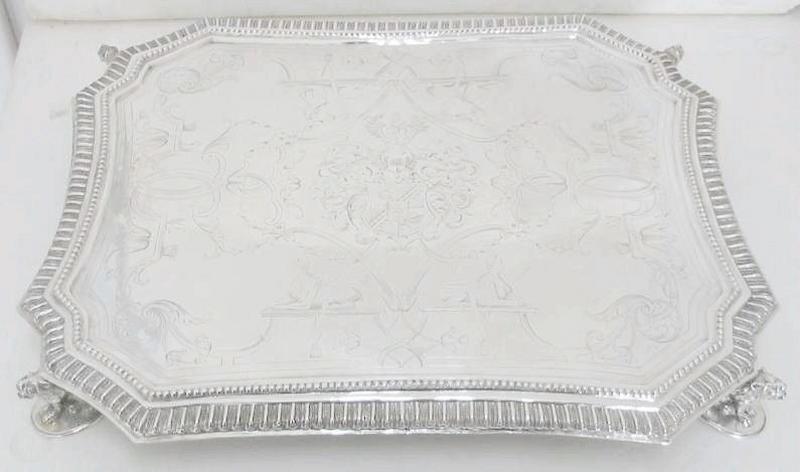 Surtout de table de format rectangulaire à côtés légèrement concaves et aux angles coupés reposant sur quatre pieds en forme de lions accroupis. La bordure extérieure est constituée d'une alternance de ressauts, de frise d'oves et de frise de perles. Le plateau est gravé en son centre d'un important décor armorié environné d'arabesques dans le style de Jean Bérain comprenant guirlandes, feuilles d'acanthe, sphinges et écureuils accostés d'un panier de noisettes. Le travail de gravure est particulièrement élaboré. Vissée sous le revers, une structure en fer découpé vient rigidifier le plateau