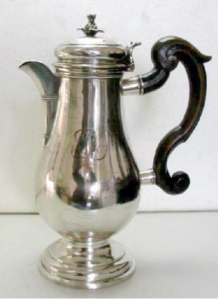 Le corps balustre repose sur un piédouche mouluré. Bec verseur appliqué rehaussé de deux moulures horizontales gravées de filets. Le couvercle est muni d'une prise en bouton feuillagé et d'un appui-pouce à enroulements. L'anse en bois naturel, à mouvement en S est rehaussée d'une volute sculptée dans la partie supérieure et d'un enroulement dans la partie inférieure