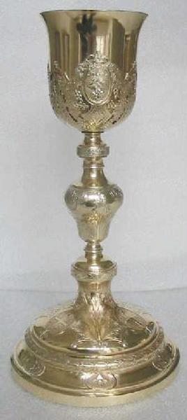 Calice à pied circulaire dont la base repoussée et ciselée comprend une doucine, ornée à intervalles réguliers de médaillons à rosettes, à laquelle succède une moulure de laurier. La terrasse du piétement comprend trois croix gravées environnées d'une gloire, inscrites respectivement dans trois médaillons ovales. Ceux-ci, surmontés d'un losange à rosette, sont reliés entre eux par une feuille d'acanthe déployée. La tige de forme balustre comporte deux noeuds à frise de postes et de feuillages encadrant un noeud central à décor de feuilles d'acanthe et de guirlandes de laurier. La coupe légèrement évasée est agrémentée d'une fausse coupe ajourée, ciselée et gravée, répétant le décor à médaillons et losanges de la base. L'intérieur des médaillons est orné de chutes de grappes de raisin nouées auxquelles répondent les épis de blé et les branchages de vignes, évoquant l'eucharistie, sur le pourtour de la fausse coupe. La forme générale du calice reste dans l'esprit des calices d'époque Louis XV, alors que le répertoire ornemental relève davantage du style néo-grec. Patène de forme circulaire unie.