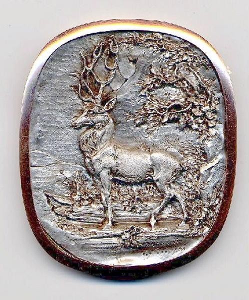Argent, argent partiellement doré et or ; Médaillon circulaire aux angles arrondis, en argent fondu, représentant un cerf dix-cors de profil en lisière de forêt. La faible épaisseur du médaillon et sa finesse d'exécution rappelle l'art de Jacques F. Kirstein alors que le modelé du bas-relief se rapproche plutôt du travail de son fils. La composition, quant à elle, s'éloigne des sujets de chasses à courre mondaines de Jacques frédéric et peut être mise en parallèle avec les gravures animalières du XVIIIe siècle, où le cerf apparaît dans toute la splendeur de son rôle de seigneur de la forêt. La plaque est sertie dans un cadre en or sur le dessus, en argent doré sur les côtés, qui maintenait le verre bombé disparu. Le montage arrière de la broche est manquant. Signature illisible gravée en pointillé sous le talus (monogramme?)