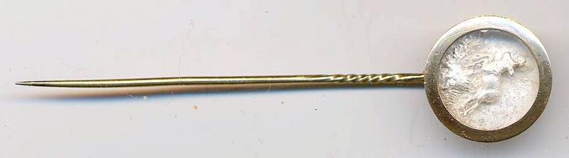 Epingle à cravate dont la tête prend la forme d'une minuscule boîte ronde en or à dessus vitré protégeant un haut-relief miniaturisé. malgré la petitesse de sa taille, le haut-relief met en scène de façon particulièrement vivante un chamois bondissant par-dessus une souche d'arbre plantée sur un terrain pentu. Le fond plat est finement ciselé de branchages feuillus donnant l'illusion d'un sous-bois. L'épingle est partiellement torsadée.