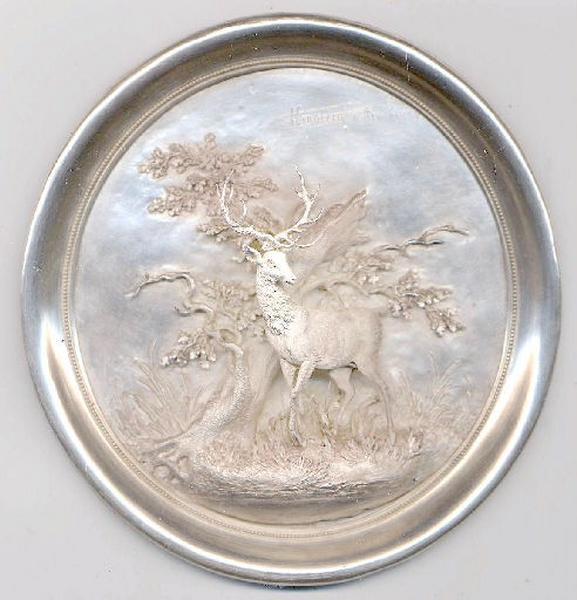 Argent, métal doré, métal noirci, bois, verre ; Dans un cadre en poirier teinté façon noyer foncé est enchâssé au creux d'une gorge de format circulaire, un haut-relief en argent fondu épousant ce même format. Le relief est serti d'un double cerclage: l'un en argent avec frises de perles, l'autre en métal doré avec frise de palmettes. L'ensemble est protégé par un verre plat fixé à la surface du cadre par un cerclage en métal noirci à frise de perles et de rais-de-coeur. La scène représente le brame du cerf. L'animal solitaire est posté devant un vieux chêne brisé. le fin travail de ciselure confine à la virtuosité dans le rendu du pelage du cervidé, de l'écorcé du chêne et de la végétation couvrant le talus en herbé qui est agrémenté, selon le procédé cher à l'artiste, d'une touffe d'herbe en feuille d'argent découpée et rapportée. Le traitement très élaboré du relief est mis en valeur par le fond uni sur lequel il se détache.