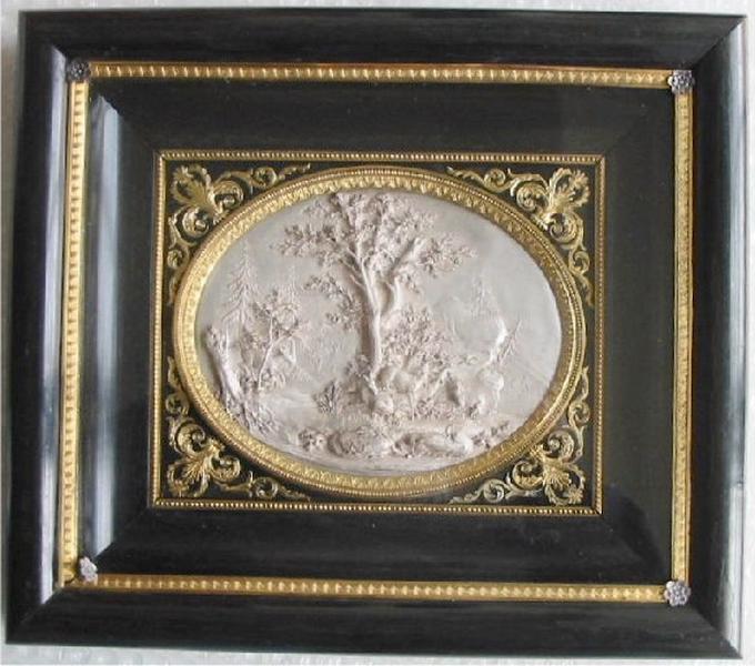 Argent, bronze ciselé et doré, bois noirci et verre ; Une plaque en argent fondu et ciselé représente une remise de chevreuils regroupant un chevreuil, deux biches et un brocard. La composition s'organise autour du groupe central de chênes planté sur un talus enherbé. le paysage arboré, où se mêlent feuillus et résineux au milieu de rochers, évoque la forêt vosgienne. Une ouverture sur le côté droit de la scène dévoile un lointain montagneux. Une vieille souche aux racines tentaculaires et des touffes d'herbe en fines feuilles d'argent découpées et rapportées ajoutent la touche pittoresque et vériste de Jacques F. Kirstein. Un élégant cadre rectangulaire en bois noirci, rehaussé de bronzes dorés en applique, sert d'écrin au haut-relief qui y est maintenu par un cerclage en bronze doré mouluré de frises de perles et de palmettes. Ce cerclage ovale est inséré dans un rectangle délimité par une frise de perles en bronze doré. Palmettes et rinceaux feuillagés prennent place dans les écoinçons ainsi formés. Le verre plat de protection est maintenu en retrait de la doucine extérieure du cadre par une plate-bande en bronze doré à frise de palmettes, rehaussée aux quatre angles par une rosette en argent. Bois noirci et bronze doré ajoutent encore en raffinement aux tableaux en argent fondu. Un tableau en relief similaire est conservé dans les collections du Mobilier National (CMLC 1175)