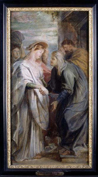 Les deux femmes se rencontrent devant la maison d'Elisabeth. La Vierge venant de gauche est vêtue de blanc et porte un petit chapeau sur son voile. Sainte Elisabeth en vêtements gris, un voile sur la tête, se penche vers la Vierge et lui saisit la main. En arrière, saint Joseph, de profil vêtu de rouge, et une servante qui porte une charge sur la tête. Zacharie sur le seuil a posé sa main sur l'épaule d'Elisabeth.