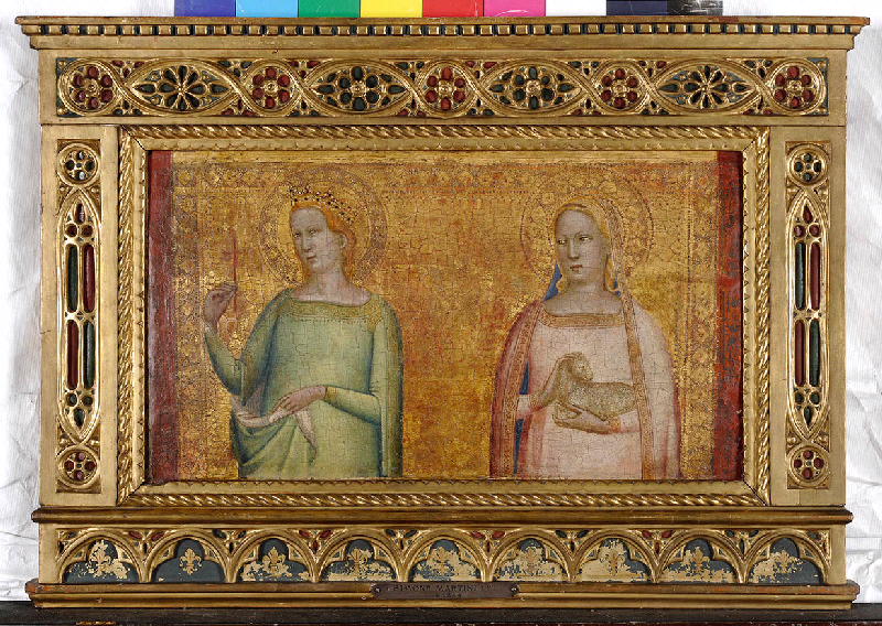 Fragment de prédelle. Sur un fond d'or gaufré, deux saintes vues à mi-corps et de trois quarts à gauche. L'une couronnée est vêtue d'une robe verte, et tient en main un petit crucifix; l'autre, enveloppée d'un manteau rose, tient dans ses mains un agneau.