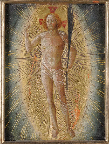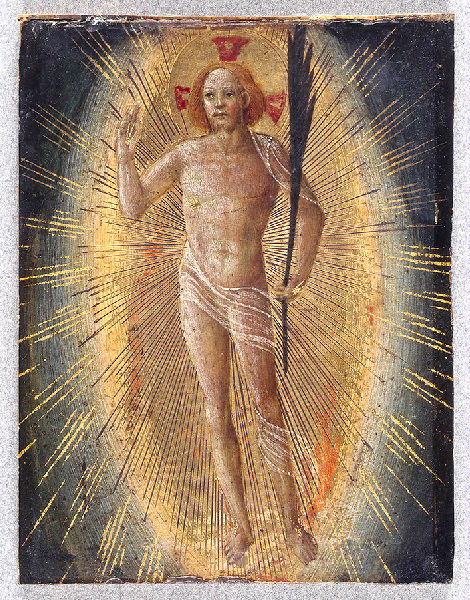 Dans une gloire d'or se détachant contre le ciel, le Christ ressuscité apparaît de face, une légère draperie enroulée sur son corps nu dont les plaies sont indiquées en or. De la main droite levée il bénit et tient dans la gauche la palme de la résurrection.