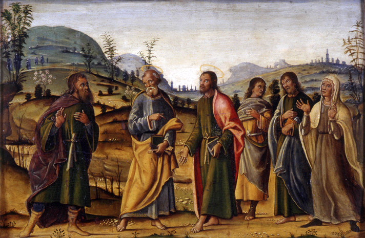 scène (saint Clément Ier, saint Pierre, draperie, clé, épée, livre) ; fond de paysage