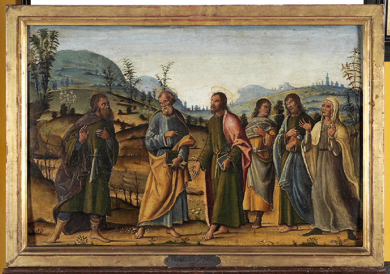 Saint Pierre et saint Clément au centre, entourés de trois saints et d'une sainte. Fond de paysage montueux avec profil d'architecture.