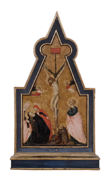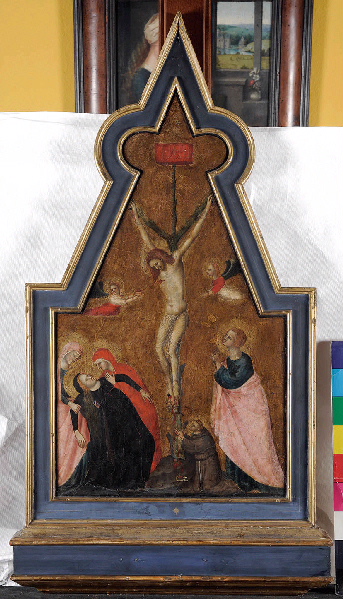 La croix faite d'un tronc d'arbre occupe le centre de la composition, le Christ est déjà mort, la tête inclinée, deux petits anges volent sur les côtés, l'un recueillant le sang qui jaillit du flanc du Sauveur. A gauche, la Vierge, vêtue de bleu sombre, défaille entre les bras des saintes femmes; à droite, saint Jean vêtu d'une robe bleue et d'un manteau rose joint les mains en regardant son maître avec compassion. Agenouillé au pied de la croix, saint François l'enserre de ses bras. Grâce à sa forme particulière, ce panneau peut être identifié comme le pinacle d'un retable.
