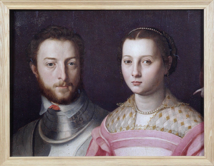 Ils sont représentés en buste, la femme légèrement en avant et le visage vers la gauche. Elle est très jeune encore et porte sur ses cheveux bruns un rang de perles et une torsade d'or; elle est vêtue d'une robe rose dont le décolleté présente une guimpe treillagée brodée d'or. L'homme, le visage légèrement tourné vers la droite porte une légère barbe châtain autour du visage, sa cuirasse est agrémentée d'un dépassant rouge et d'un col de linge blanc. Fond brunâtre.