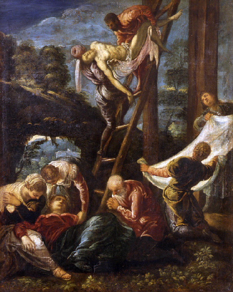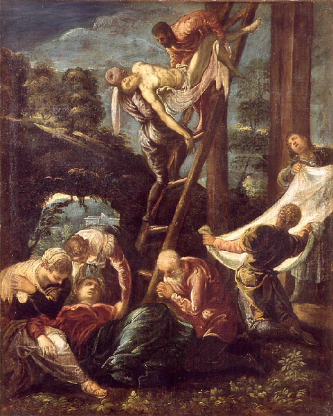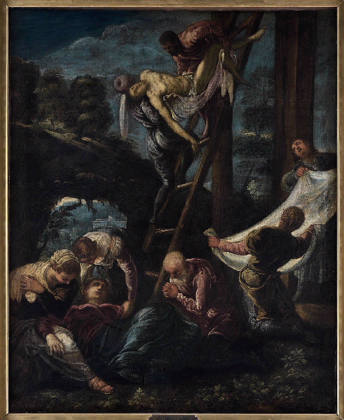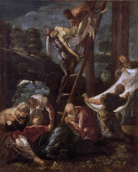 L'échelle est appuyée contre la croix. Sur cette échelle, à mi-hauteur, Joseph d'Arimathie et un de ses compagnons descendent le corps du Christ; à droite, saint Jean et un autre homme tiennent des deux mains le linceul prêt à le recevoir; Au premier plan, deux saintes femmes éplorées secourent la Vierge évanouie, gisant à terre. Nicomède (?) agenouillé, prie aux pieds de la Vierge. A gauche, colline percée à sa base d'une grotte, à travers laquelle apparaît un lointain bleu avec architectures.