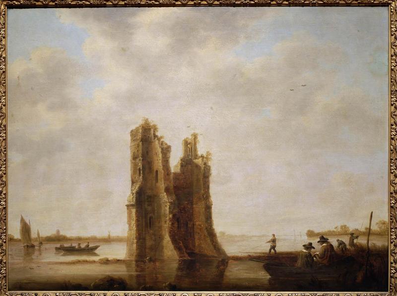 Au centre les ruines d'un gros donjon se mirent dans les eaux calmes de la Meuse. A l'horizon, à gauche, se profile la silhouette caractéristique de la 'Grande Eglise' de Dordrecht. Canots et voiliers sur le fleuve; à droite deux peintres dessinent, assis dans une barque amarrée près du rivage. Derrière eux, plusieurs pêcheurs retirent leurs filets. Ciel bleu nuageux
