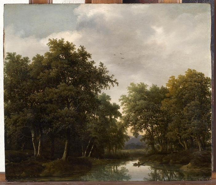 Au premier plan, entre deux groupes de chênes sombres et touffus, un petit étang aux eaux calmes et transparentes forme une tache plus claire. Vers la droite, une barque avec un pêcheur. Au fond, entre les arbres, échappée vers des prairies et des collines boisées. Ciel clair avec quelques nuages et des oiseaux