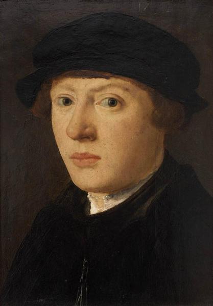 En buste de trois quarts à gauche. Il porte un vêtement sombre à col blanc et ses cheveux châtains roux sont coiffés d'une toque noire. Fond gris