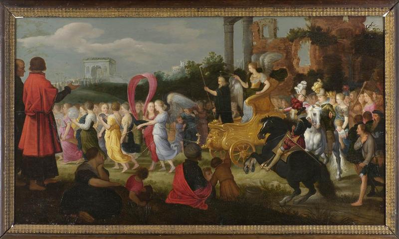 scène (triomphe, allégorie, le temps, attroupement, char, cheval, ruines)