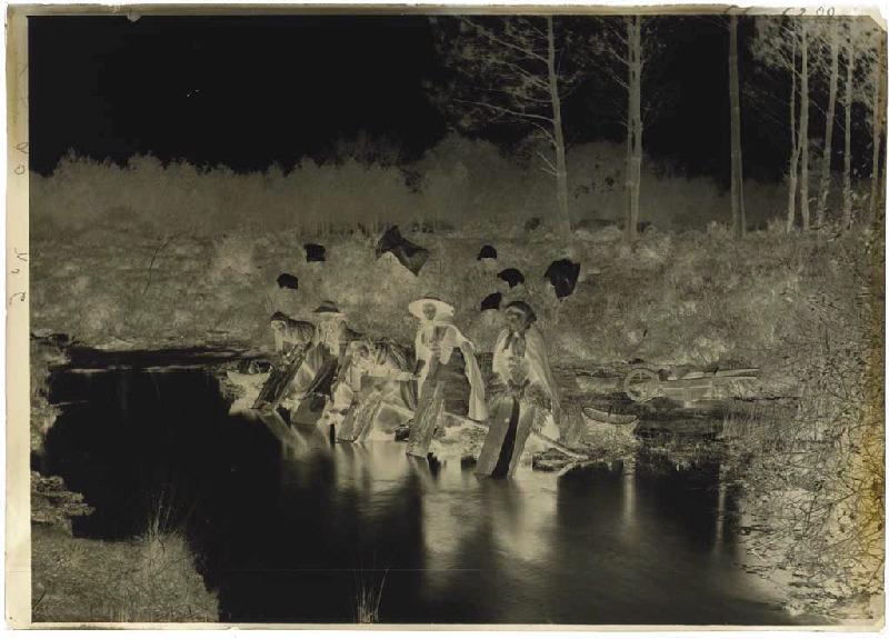 Cinq femmes faisant la lessive ('bugade') au bord d'un ruisseau, en plein coeur de la forêt. En arrière-plan, on aperçoit le linge qui sèche sur des genêts.